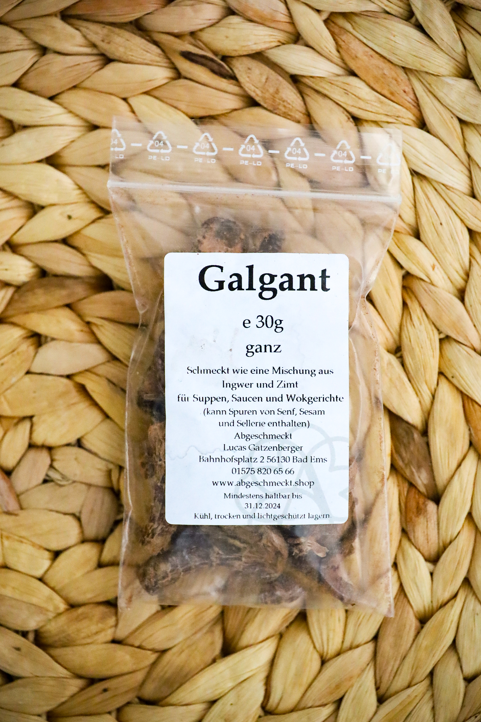 Galgant ist eine fernöstliche Wurzel und wird auch als Thai-Ingwer bezeichnet. Der Geschmack ist scharf und leicht zitronig. Die Wurzel stammt aus Thailand und wird seit Jahrhunderten in der asiatischen Küche verwendet.